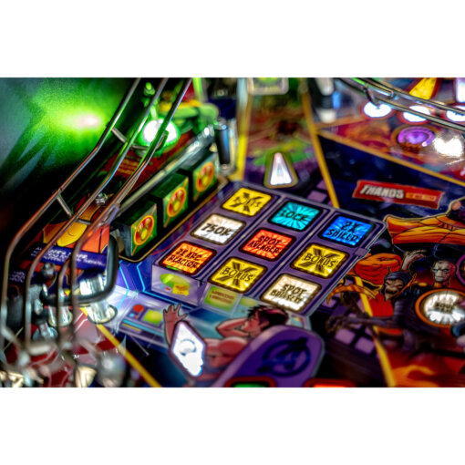 This machine delivers incredible innovation across all editions—Pro, Premium, and Limited Edition. Featuring the interactive Dr. Strange spinning kinetic sling ring disc, Avengers Tower magnetic lock ramp, Thor captive ball, Hulk spinning target, and custom wireform ramps, gameplay is fast, smooth, and highly engaging. The Avengers Computer Bingo grid drop bank and Iron Man Multiball add exciting depth and challenge.