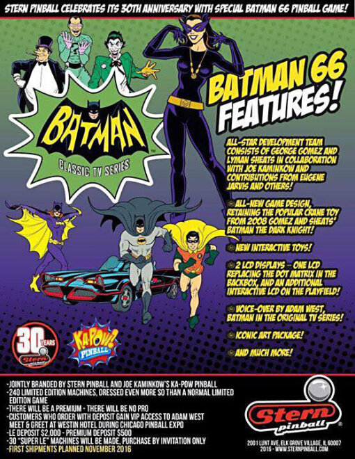 The Batman ’66 Premium Pinball Machine by Stern celebrates the iconic 1960s television series with exciting gameplay, colorful design, and authentic theme integration. Featuring the beloved characters of Gotham City, this machine brings classic camp style and fast-paced pinball action together in one premium experience. Designed with engaging ramps, interactive features, and immersive sound effects, it delivers dynamic gameplay for collectors and enthusiasts. The Premium edition includes enhanced mechanisms and upgraded features that elevate performance and replay value. Built with Stern’s industry-leading craftsmanship, this machine offers durability, reliability, and long-term enjoyment for home game rooms and entertainment spaces.