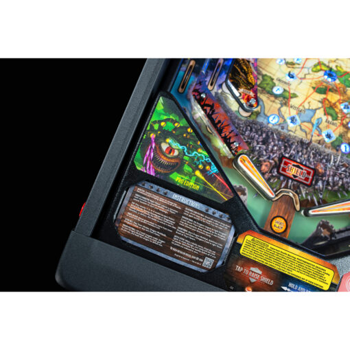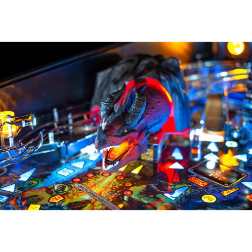 Battle Rath the Relentless, the red dragon, the most advanced animatronic mech in pinball, intelligently reacts to player action with multi-axis motion and features omnidirectional impact sensing technology. Voiced by the iconic Michael Dorn, players will attempt to defeat Rath the Relentless with pinballs and by hitting the 3-bank target, steal its treasure. When Rath the Relentless breathes his magnificent fire, multiple pinballs shoot from its mouth but be prepared. Players can activate a metal shield between the flippers to not only defend against attacks but also assist with playfield shots.