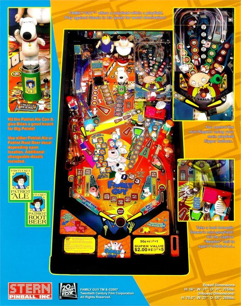Players experience mission-based objectives, multiball excitement, and themed challenges based on the antics of the Griffin family. The game features interactive playfield elements, engaging sound clips, and vibrant artwork that reflects the cartoon’s unique style. With its entertaining layout and humorous callouts, this pinball machine delivers strong replay value for collectors, arcade enthusiasts, and fans of the show.