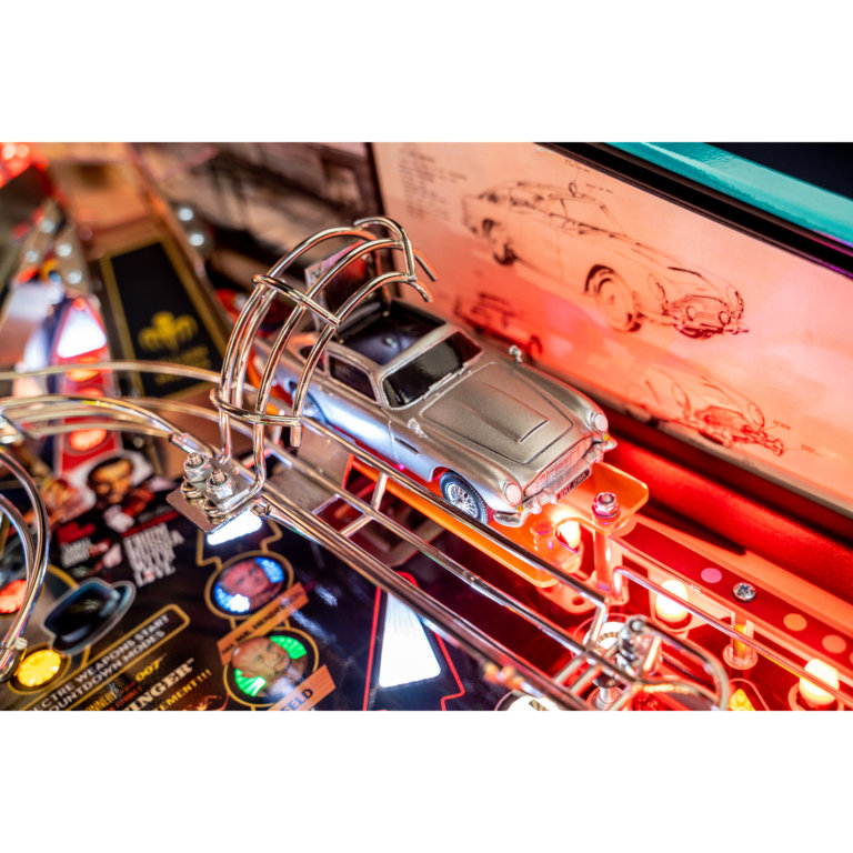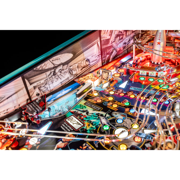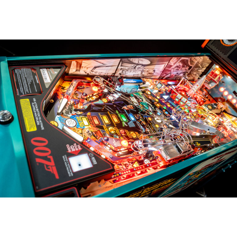 Gameplay features mission-driven objectives, fast ramps, multiball modes, and interactive targets inspired by classic Bond moments. Bright RGB LED lighting systems create dramatic effects during gameplay, enhancing immersion. Advanced audio technology delivers themed music and cinematic sound effects that match the spy adventure atmosphere.