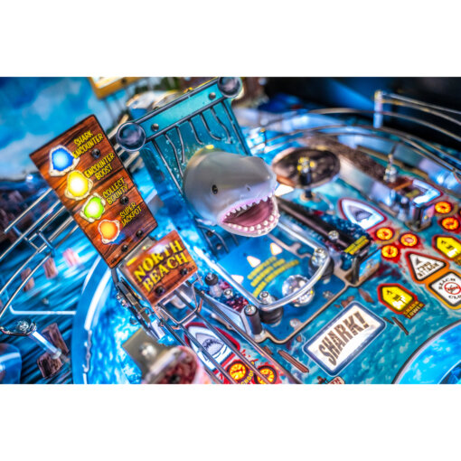 Players take on the role of a hero working to stop shark attacks, complete mission-based objectives, and progress through cinematic modes based on key moments from the film series. The machine features smooth ramps, engaging target banks, and dynamic multiball action that keeps gameplay flowing. With immersive sound effects, themed visuals, and dramatic lighting, the experience recreates the tension and excitement of the movie on a pinball playfield.