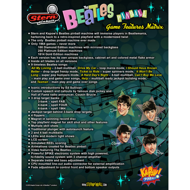 The Gold Edition features enhanced cabinet artwork, exclusive design elements, upgraded lighting effects, and premium finish details that distinguish it from standard versions. Players enjoy fast-paced gameplay with Beatles-themed missions, multiball action, and interactive objectives synchronized with iconic songs. The immersive audio system integrates the band’s timeless music, creating an engaging and nostalgic experience for fans and collectors alike 🎵✨.