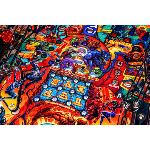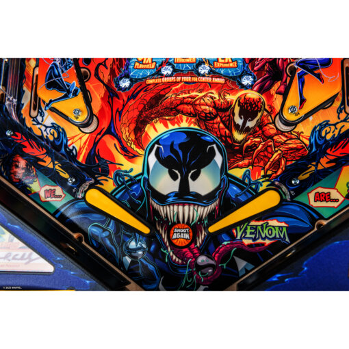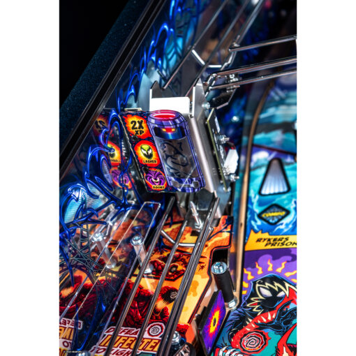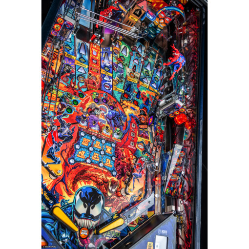 Players bond with different hosts such as Eddie Brock, Flash Thompson, and Gwen Stacy, each changing the rules, music, and gameplay style. The machine also features interactive elements like the Carnage captive ball, symbiote containment ball locks, and surprise Doppelganger attacks that keep the action fast and unpredictable.
