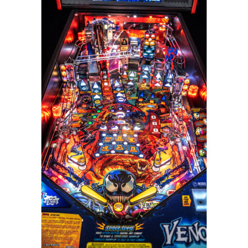 The Venom Premium Pinball Machine by Stern Pinball delivers a fast, action-packed experience inspired by Venom and the dark world of Marvel’s symbiotes. Players step into the role of Venom and bond with different hosts such as Eddie Brock, Flash Thompson, and Gwen Stacy, each offering unique gameplay advantages and rule changes.