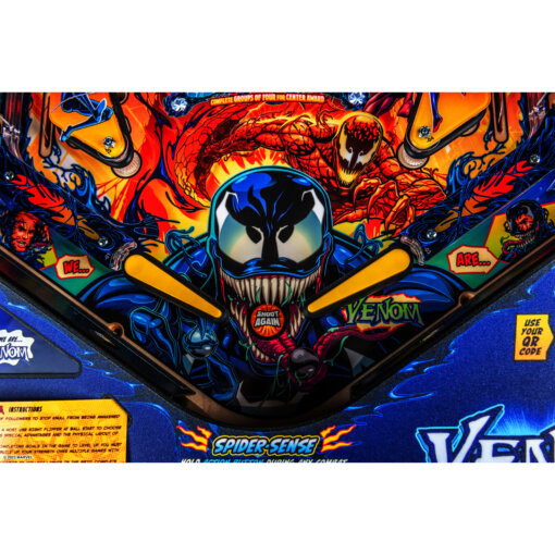 The Premium edition features interactive mechanical elements including symbiote containment ball locks, a Carnage captive ball, and a Doppelganger surprise attack mechanism that introduces additional targets and challenges during gameplay. Players battle Venom’s enemy Carnage while completing missions and multiball modes to stop the rise of the symbiote god Knull.