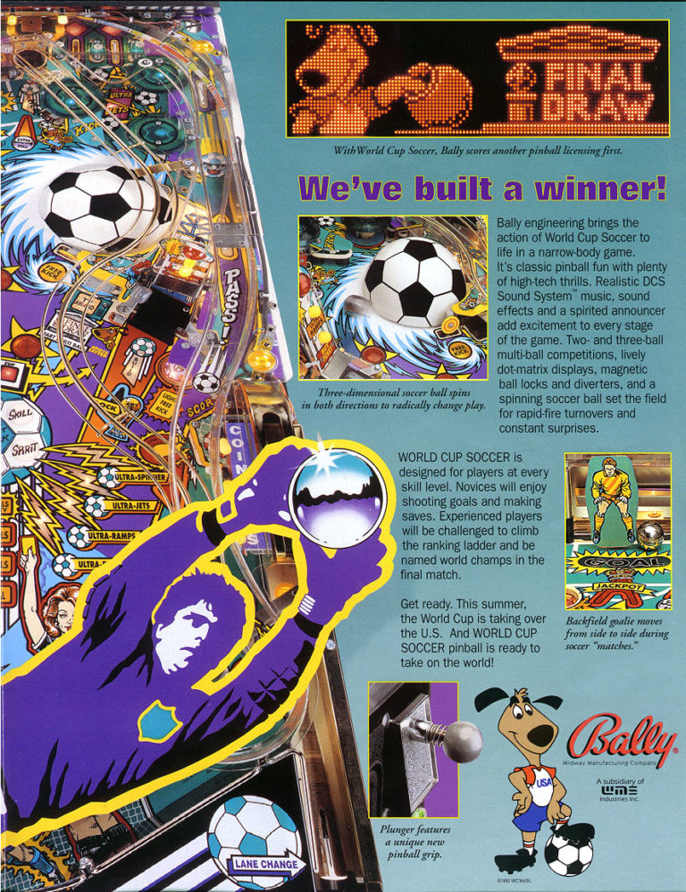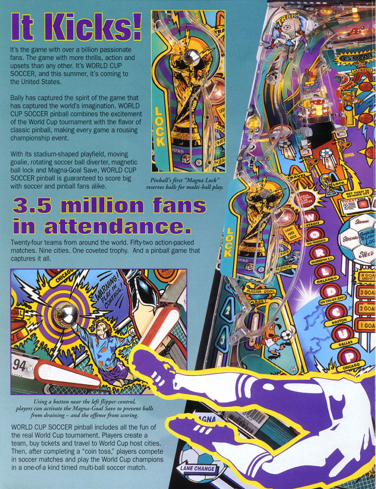 Players experience fast ramps, skill shots, multiball modes, and interactive targets designed around soccer action. The playfield includes vibrant artwork, stadium-inspired design elements, and responsive controls that create an energetic arcade atmosphere. Its rule set encourages strategic play while maintaining exciting flow, making it enjoyable for both casual players and serious competitors.
